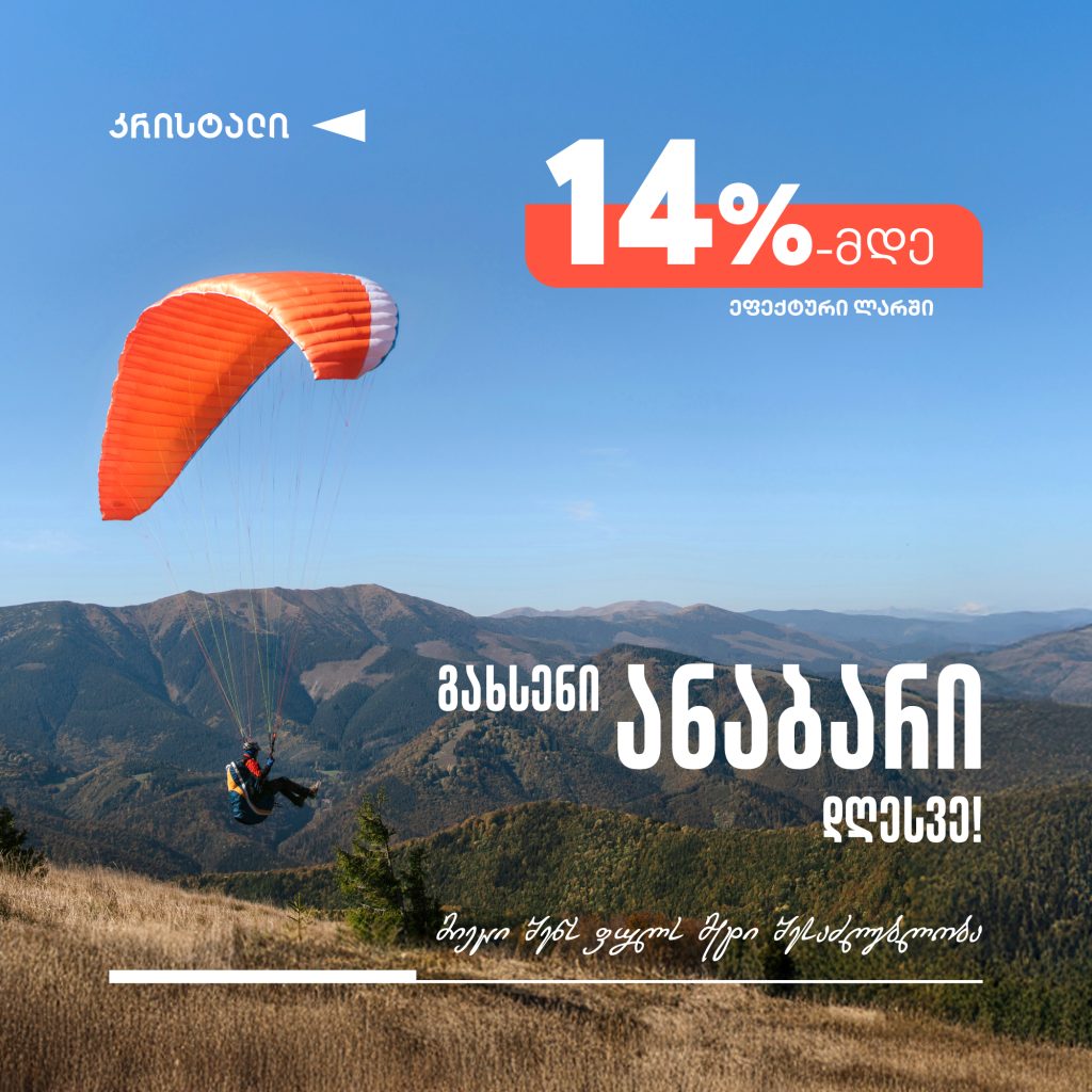 ანაბარი, რომელიც სხვებზე მეტ სარგებელს გთავაზობს! გახსენი ანაბარი კრისტალში, გაზარდე შენი შესაძლებლობები და მიაღწიე მიზანს უფრო სწრაფად! მიიღე მაღალი საპროცენტო სარგებელი: 13.00%-მდე ეფექტური ლარში 6.25%-მდე ეფექტური დოლარში 4.75%-მდე ეფექტური ევროში ანაბარი სახელი, გვარი(Required) ტელეფონის ნომერი(Required)აირჩიე ფილიალი(Required)აირჩიე ფილიალიაბაშაახალციხებათუმი, ჭავჭავაძის ფილიალიბათუმი, აბუსელიძის ფილიალიბორჯომიგარდაბანიგორიგურჯაანიდედოფლისწყაროდუშეთივანიზესტაფონიზუგდიდითბილისის გლდანის ფილიალითბილისი, დიდუბე, წერეთლის ფილიალითბილისი, დიდუბე, ცაბაძის სერვის ცენტრითბილისის ვარკეთილის ფილიალითბილისის საბურთალოს ფილიალითერჯოლალაგოდეხილანჩხუთიმარნეულიმარტვილიმესტიაოზურგეთირუსთავისაგარეჯოსამტრედიასაჩხერესენაკიფოთიქარელიქობულეთიქუთაისი, გამსახურდიას ფილიალიქუთაისი, წერეთლის ფილიალიქუთაისი, ნიკეას ფილიალიყვარელიჩხოროწყუწალენჯიხაწნორიწყალტუბოხაშურიხელვაჩაურიხობიხონიკასპითელავიმარნეულიგანაცხადის გასაგზავნად მონიშნეთ ქვემოთ მოცემული ველი(Required) ვეთანხმები, რომ განაცხადში ჩემ მიერ მითითებული ინფორმაცია/მონაცემები ნამდვილი და ზუსტია, შეესაბამება რეალურ ფაქტებს და გამოვთქვამ თანხმობას სს მიკრობანკი „კრისტალის“ (საიდენტიფიკაციო კოდი 212896570, მის: ქუთაისი, ნიკეას ქ. #22, ტელ: 0322022020, ვებგვერდი www.crystal.ge), როგორც მონაცემთა დამუშავებაზე პასუხისმგებელი პირის მიერ აღნიშნული მონაცემების დამუშავებაზე, წარმოდგენილი განაცხადის დამუშავება-განხილვისა და შესაბამისი ხელშეკრულების დადების/მომსახურების მიზნებისთვის. ასევე ვადასტურებ, რომ გაცნობილი ვარ და ვეთანხმები ვებ გვერდზე www.crystal.ge განთავსებულ მომხმარებელთა პერსონალური მონაცემების დამუშავების საინფორმაციო დოკუმენტს. CAPTCHA