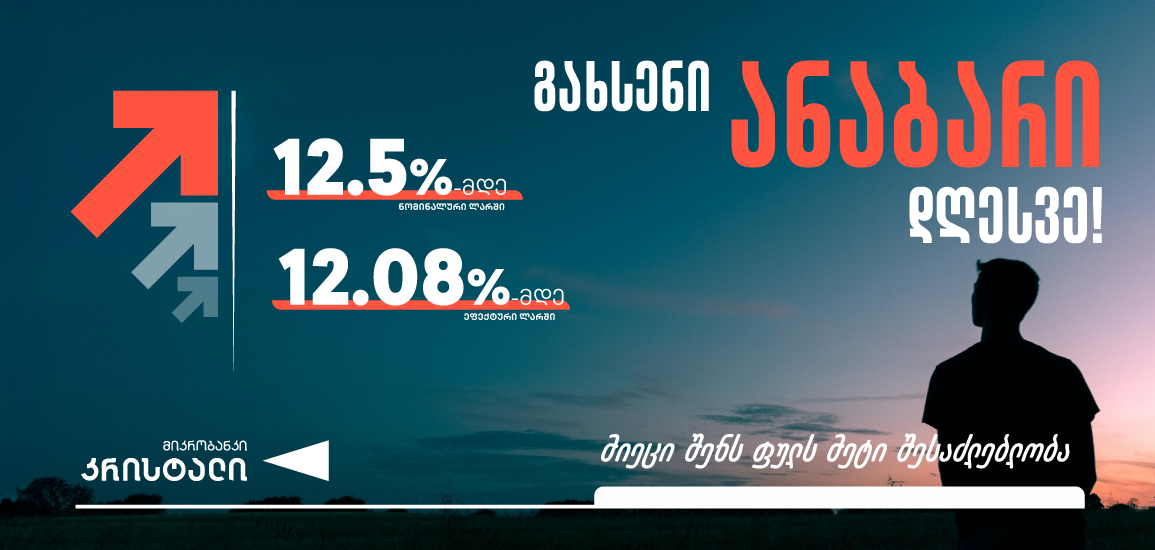 - სანდო ფინანსური პარტნიორი – მიკრობანკი “კრისტალი” საქართველოში მოქმედი წამყვანი ფინანსური ინსტიტუტია, რომელიც დინამიურად იზრდება და ვითარდება. კომპანიამ 2025 წლის 12 თებერვალს, საქართველოს ეროვნული ბანკისგან მიკრობანკის ლიცენზია მიიღო. კომპანიისადმი საერთაშორისო ინვესტორების მაღალი ნდობა და სოციალური პასუხისმგებლობის კულტურა, კრისტალს განსაკუთრებულად გამორჩეულ პარტნიორად აქცევს თქვენს ფინანსურ გადაწყვეტილებებში.